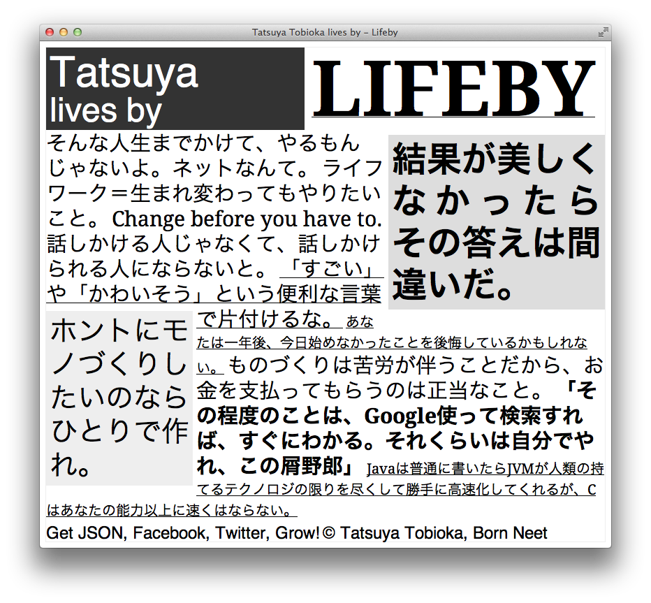 ネットサーフィンも含めてザッピングは基本的には時間の浪費だけど、みんなの座右の銘を眺めてたら、少しはモチベーションがあがるんじゃないか。