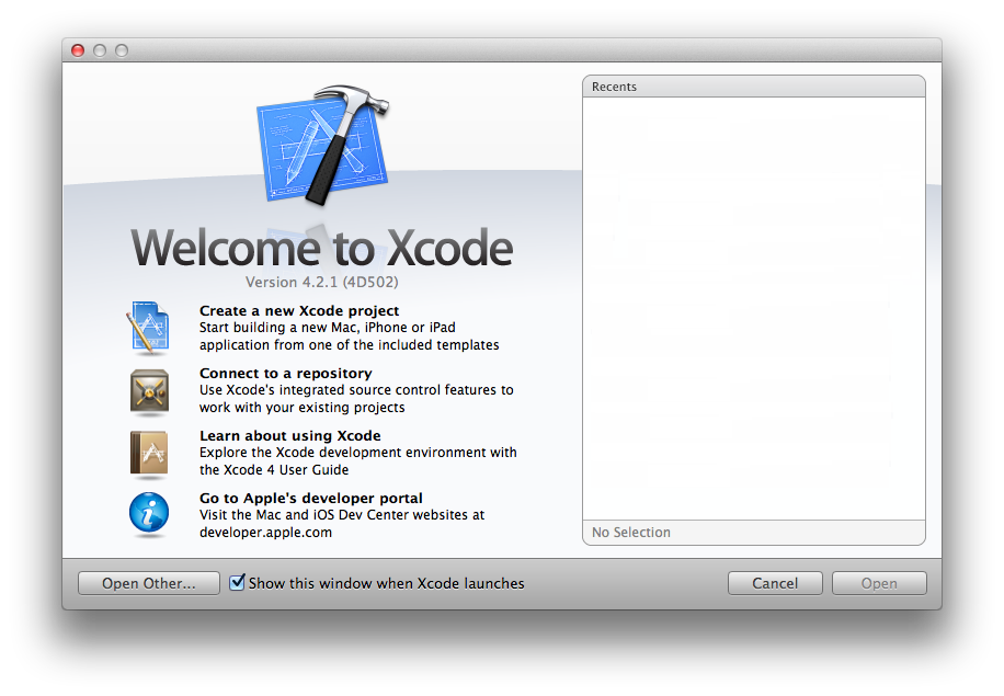 Xcodeを起動して、Welcome画面から、
