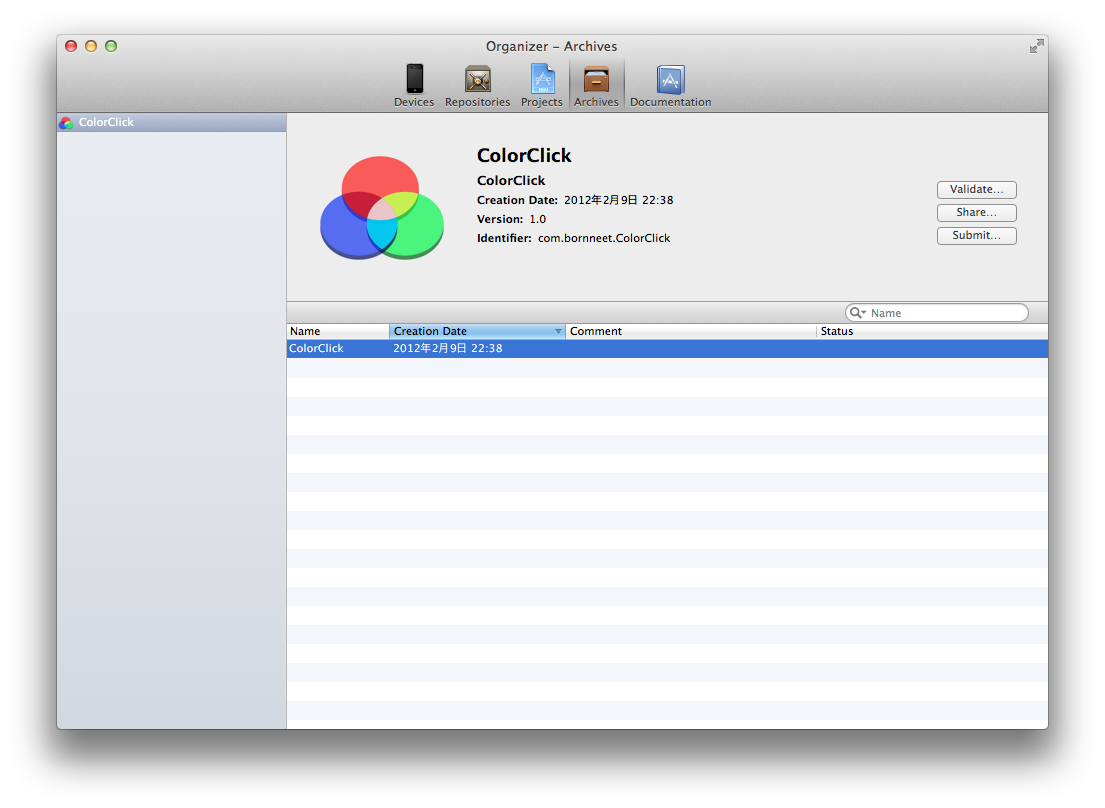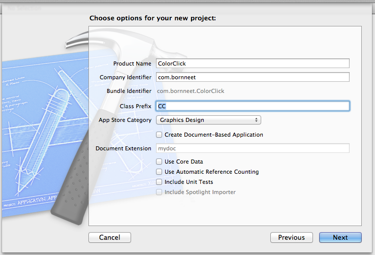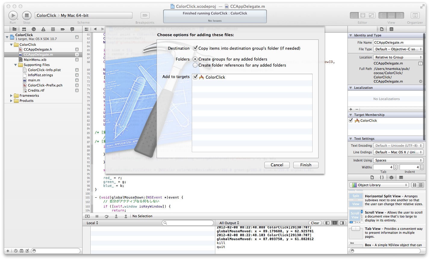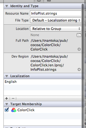 ただ、会社名が、Copyright © 2012年 __MyCompanyName__. All rights reserved.になってしまっていて、あまりにも残念なので、ColorClick-info.plistを修正しておきます。