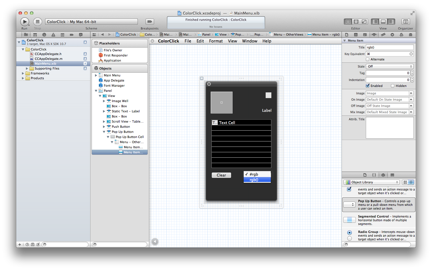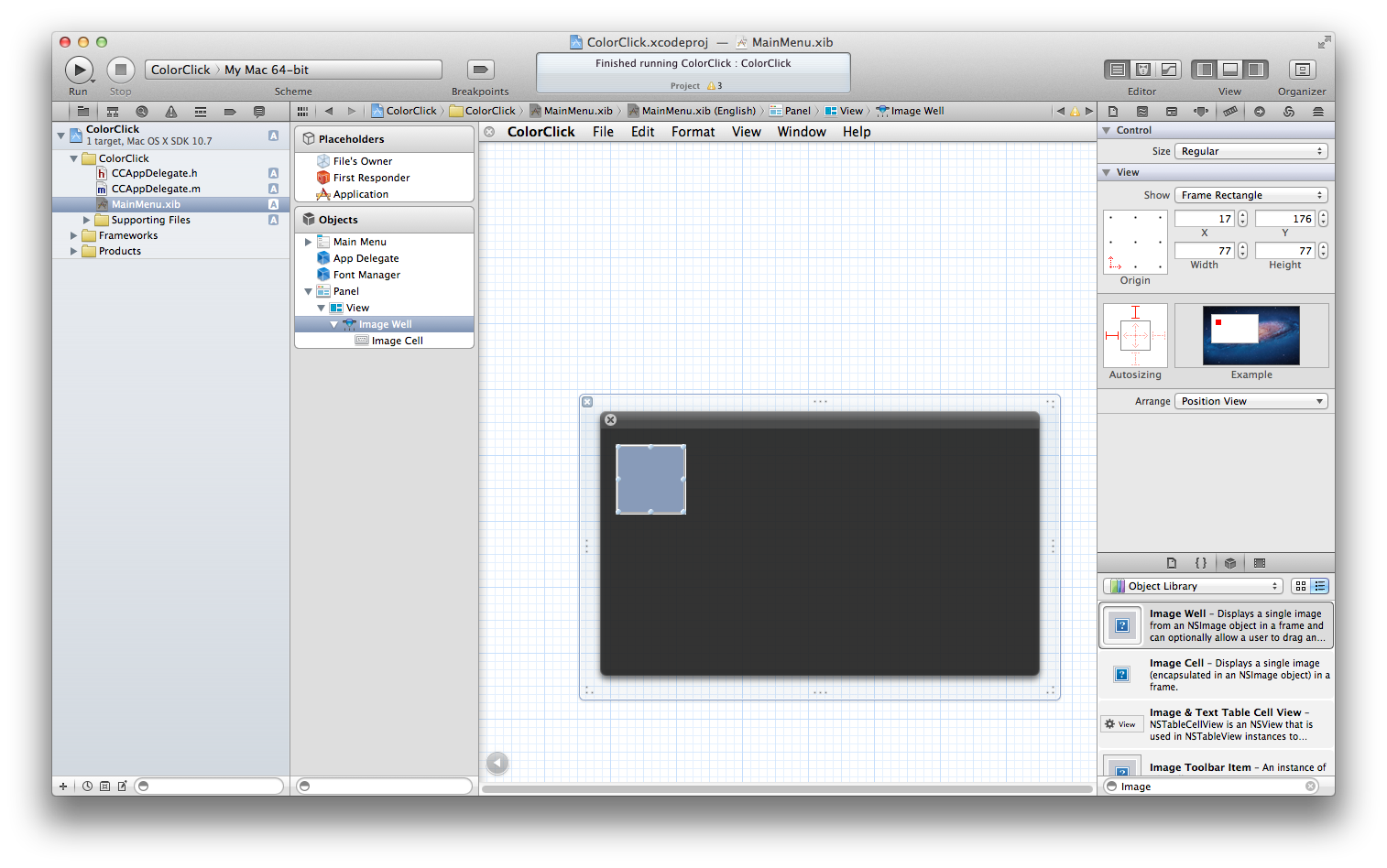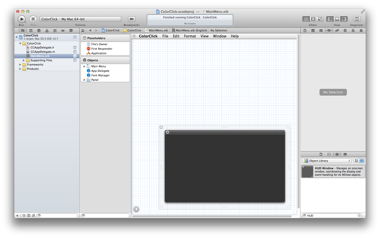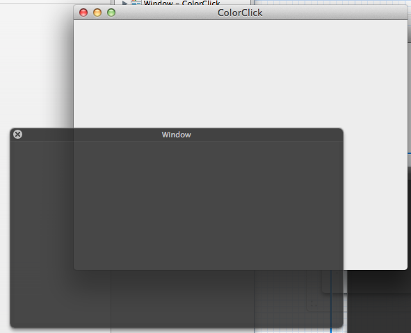 Interface Builder(以降IB)のObjectsからWindow - ColorClickを選択してdeleteキーで削除しましょう。