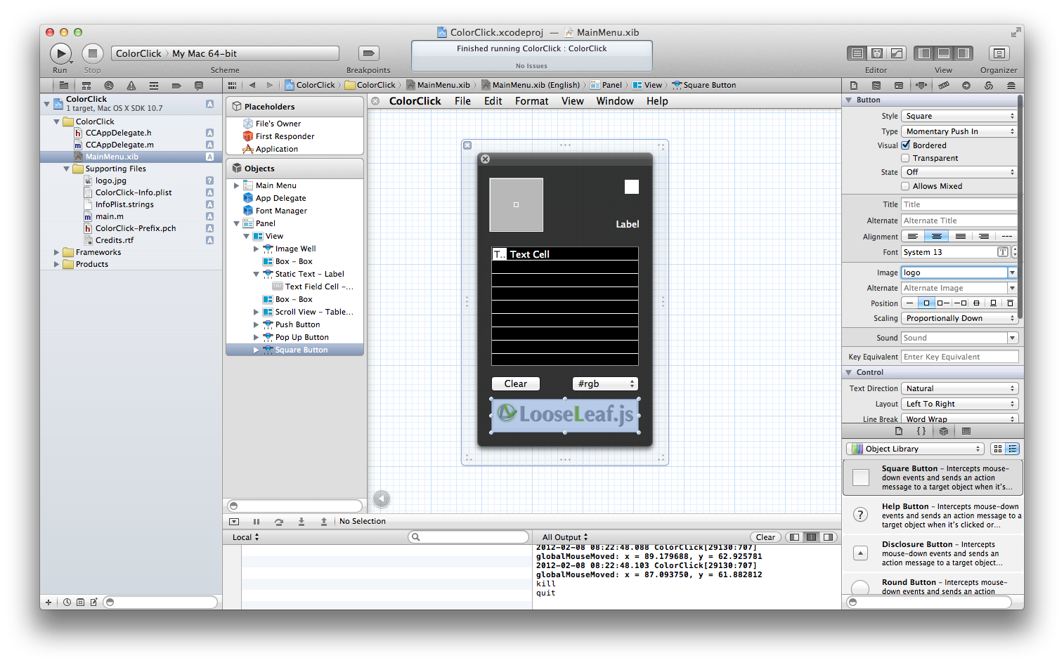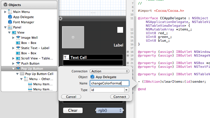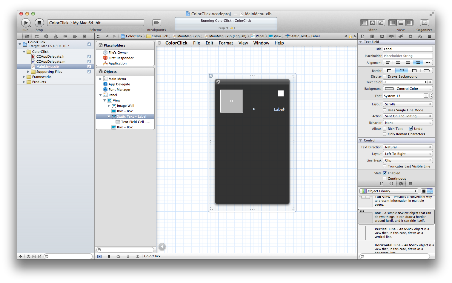 Interface Builder(以降IB)のObjectsからWindow - ColorClickを選択してdeleteキーで削除しましょう。