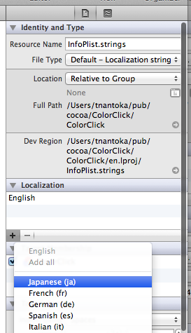 InfoPlist.stringsのFile Inspectorを見ると、LocalizationがEnglishだけになっているので、+ボタンを押してJapanese (ja)を追加します。